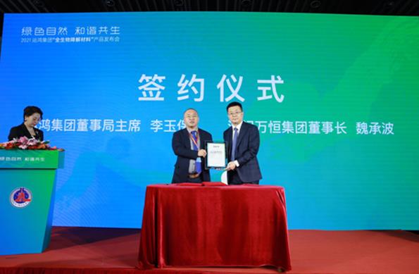 发布会上,运鸿集团与澳门万恒集团有限公司签订了战略合作协议。基于双方良好的信任及长远发展战略上的考虑,就“全生物降解”项目在粤港澳大湾区开展项目代理合作,该项签约市场份额达30亿美元。两大企业的强强联合将是一个相互赋能的过程,未来将抢抓政策机遇,持续加强对接,尽快推动合作落实落地。同时以此次合作为起点,双方结成深度战略合作伙伴关系,秉持绿色发展、高效发展和高质量发展的理念,推动全生物降解材料的应用,积极探索现代化绿色产业发展新模式,加快推动经济社会发展全面绿色转型,建设人与自然和谐共生的现代化,共同谱写“十四五”高质量发展新篇章。