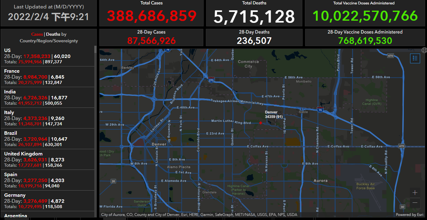截至北京时间2022年2月4日22点39分,全球新冠肺炎确诊病例上升至388,686,859例,其中死亡病例调整为5715128例。