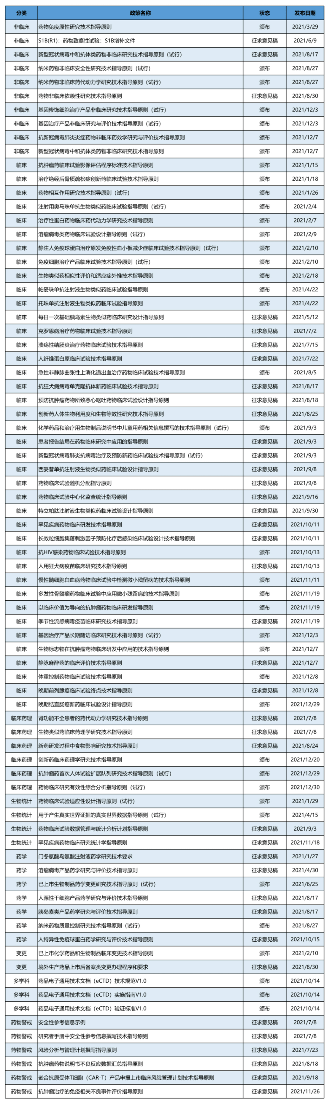笔者梳理了2021年度CDE公示已发布的与生物医药行业有关技术指导原则有78个;其中非临床10个、临床40个、临床药理6个、生物统计4个、药学7个、药物警戒6个、变更2个、多学科3个;