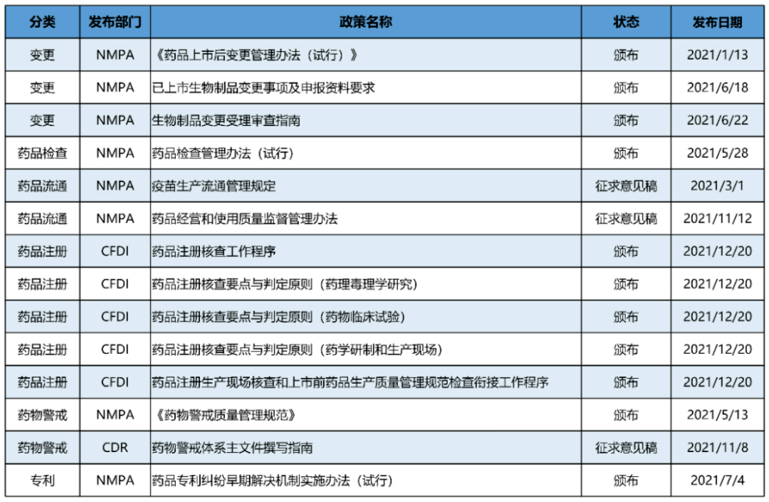 本文利用相关数据库[国家药品监督管理局等官网]重点梳理了2021年中国生物行业主要政策发布概况,法规更新频繁,信息量巨大,如有遗漏,欢迎大家留言补充,希望制药人高度关注法规变化,并结合企业自身的风险点,制定风控措施。