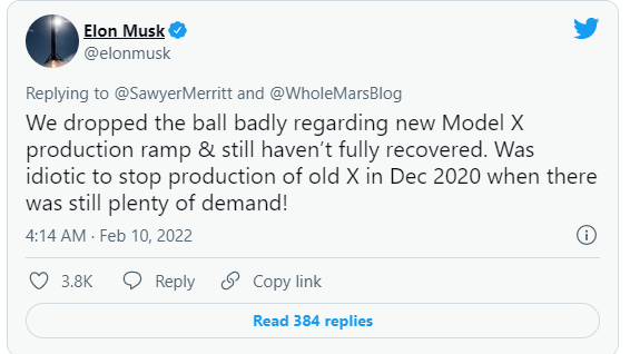 埃隆·马斯克称,2020 年 12 月的这一决定对生产产生的影响仍然困扰着这家电动汽车制造商。“我们在新的Model X 生产上失控了,并且产能仍未完全恢复。2020年12月,当车辆需求仍然很大时,公司却停止了生产旧款Model X,这真是愚蠢的决定!” 他表示,Model X非常难造,主要是因为内饰。
