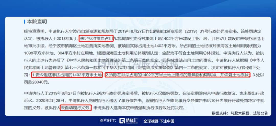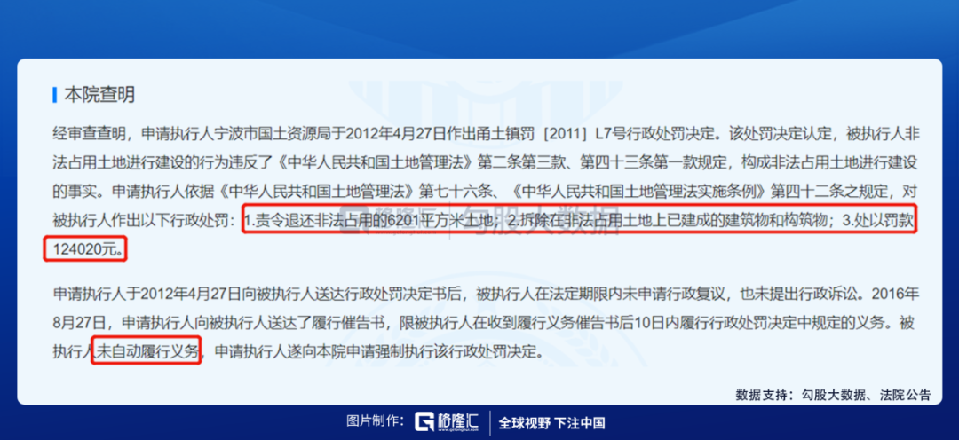 其一,中国裁判文书网(2017)浙0211行审288号:2012年4月,宁波国土局对涌孝水业作出行政处罚,责令退还非法占用6201平方米土地、拆除在非法占用土地上已建成的建筑物和构筑物、处以罚款124020元。