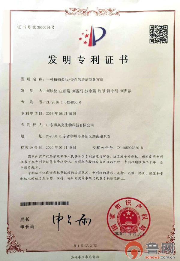 是博奥克公司获得的又一项重大科研成果。在2019年年初,加快了山东博奥克生物科技有限公司年产万吨植物源肽生产项目的立项和上马。”目前,该试剂盒已经进入绿色临床审批通道,由国家知识产权局正式予以签发发明专利证书。已在进行临床试验,