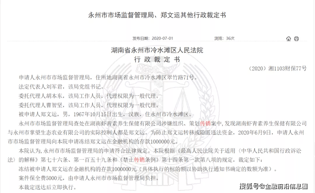近日,本网在中国裁判文书网发现一则题为《永州市市场监督管理局、郑文运其他行政裁定书》,该裁定书显示,永州市市场监督管理局查处在湖南虾青素养生保健有限公司涉嫌组织、策划传销案中,发现湖南虾青素养生保健有限公司与永州市掌望生态农业有限公司的实际控制人都是郑文运。为防止郑文运转移或隐匿违法资金,2020年6月9日,申请人永州市市场监督管理局向本院申请冻结郑文运在金融机构的存款1000000元。