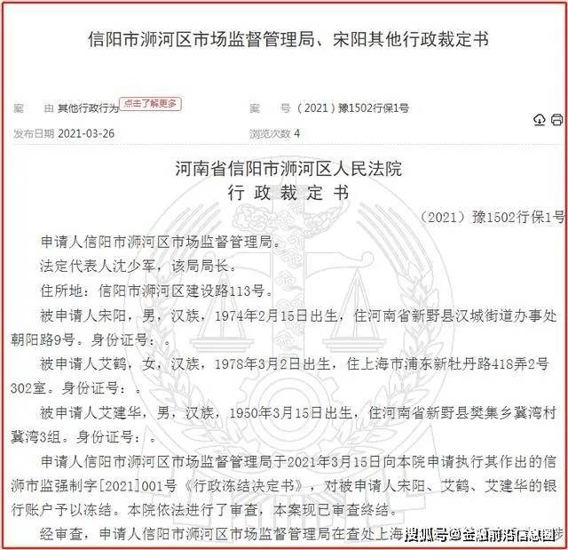 据该裁定书显示,申请人信阳市浉河区市场监督管理局于2021年3月15日向本院申请执行其作出的信浉市监强制字[2021]001号《行政冻结决定书》,对被申请人宋阳、艾鹤、艾建华的银行账户予以冻结。冻结额度为3000万元,冻结期限为一年。