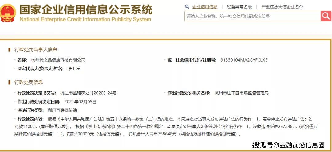 近日,国家企业信用信息公示系统一则行政处罚信息显示,杭州梵之品健康科技有限公司因“利用互联网传销”被杭州市江干区市场监督管理局处罚。