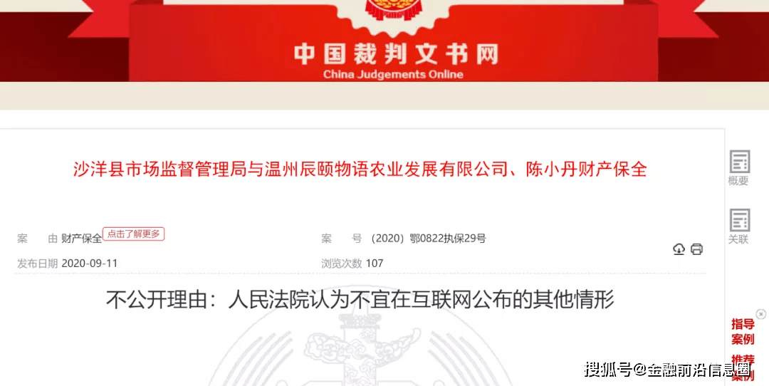 不久前,本网在中国裁判文书网注意到一则题为《沙洋县市场监督管理局与温州辰颐物语农业发展有限公司、陈小丹财产保全》(以下简称:《财产保全》),其发布时间为2020年9月11日, 案号(2020)鄂0822执保29号,但该《财产保全》显示,不公开理由:人民法院认为不宜在互联网公布的其他情形。