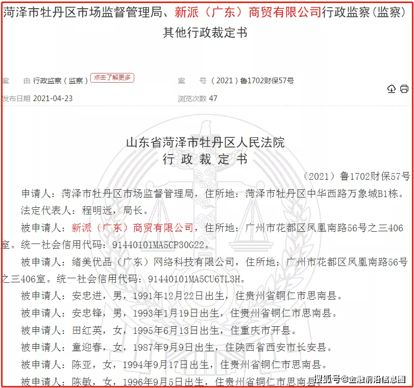 本局决定对当事人组织策划传销的行为作:1、没收违法所得257248元(贰拾伍万柒仟贰佰肆拾捌元整);近日,近日,据《其他行政裁定书》显示,其处罚日期为2021年2月19日,根据《中华人民共和国推广法》第五十八条第一款第(二)项的规定,本网了解到山东省菏泽市牡丹区市场监督管理局向当地法院申请冻结新派(广东)商贸有限公司、绪美优品(广东)网络科技有限公司、安某忠、安某锋、田某英、童某迎、陈某、张某翔、李某玲、韦某云、杨某娥、胡某冰、董某秀、李某、宋某平、吴某泉、黄某妍、蔡某艳在微信、支付宝及金融机构中的存款、理财产品等财产共计6990万元。处罚金额为50万元处罚单位是杭州市富阳区市场监督管理局,本网在“信用中国”注意到一则关于广东凤凰高科食品进出口有限公司的行政处罚决定文书:(杭富)市监罚处字[2020]0111号 ,