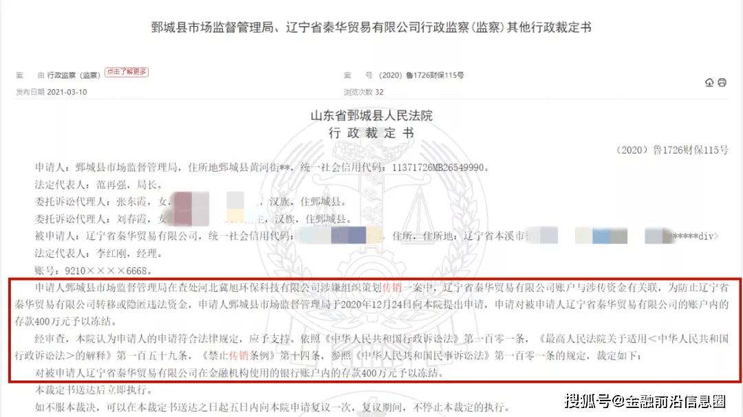 据《行政裁定书》显示,申请人鄄城县市场监督管理局在查处河北冀旭环保科技有限公司涉嫌组织策划传销一案中,辽宁省秦华贸易有限公司账户与涉传资金有关联,为防止辽宁省秦华贸易有限公司转移或隐匿违法资金,申请人鄄城县市场监督管理局于2020年12月24日向本院提出申请,申请对被申请人辽宁省秦华贸易有限公司的账户内的存款400万元予以冻结。