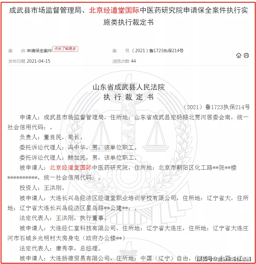 山东省成武县市场监督管理局向当地人民法院申请冻结北京经道堂国际中医药研究院、大连长兴岛经济区经道堂职业培训学校有限公司、大连经仁堂科技有限公司、大连扬德贸易有限公司、王洪刚健康管理(大连)有限公司、联服(辽宁)网络科技有限公司、大连景圣科技有限公司、大连岐伯贸易有限公司、樟树市灵智信息服务有限公司以及王洪刚、王某、田某勤、许某、薛某、李某智、赵某、胡某敏、何某龙名下银行存款9900万元。