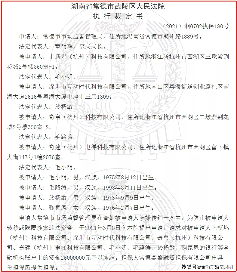 4月8日,反传防骗卫士在中国裁判文书网注意到一则题为《常德市市场监督管理局、上新坞(杭州)科技有限公司执行实施类执行裁定书》(以下简称:《执行裁定书》)。
