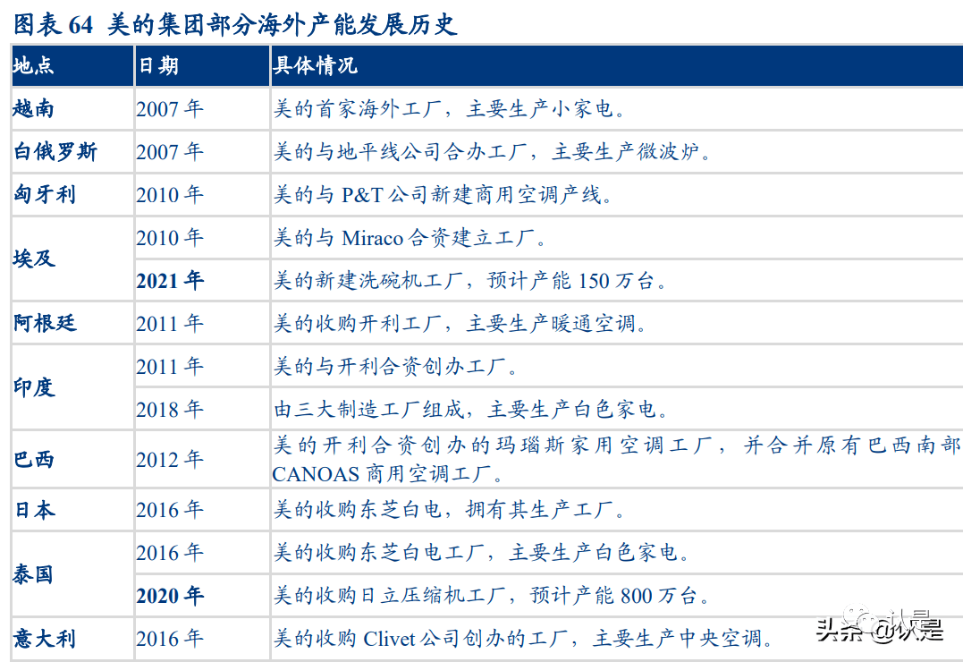 美的集团的海外业务布局持续推进。早在 1991 年,美的就正式提出“做世界的美的” 口号,自此美的出口创汇连续 8 年位居中国家电行业第一名。2001 年起,美的开 始在海外投资建立工厂,2007 年美的在越南布局首家海外生产基地,随后在白俄罗斯、 埃及、阿根廷、印度、巴西和泰国分别建立海外生产基地。2015 年公司开始将外销业 务模式向 OBM 转变,加速并购品牌实现海外自有品牌替代,先后收购日本东芝白电业 务、意大利中央空调 Clivet、伊莱克斯吸尘器品牌 Eureka 等公司