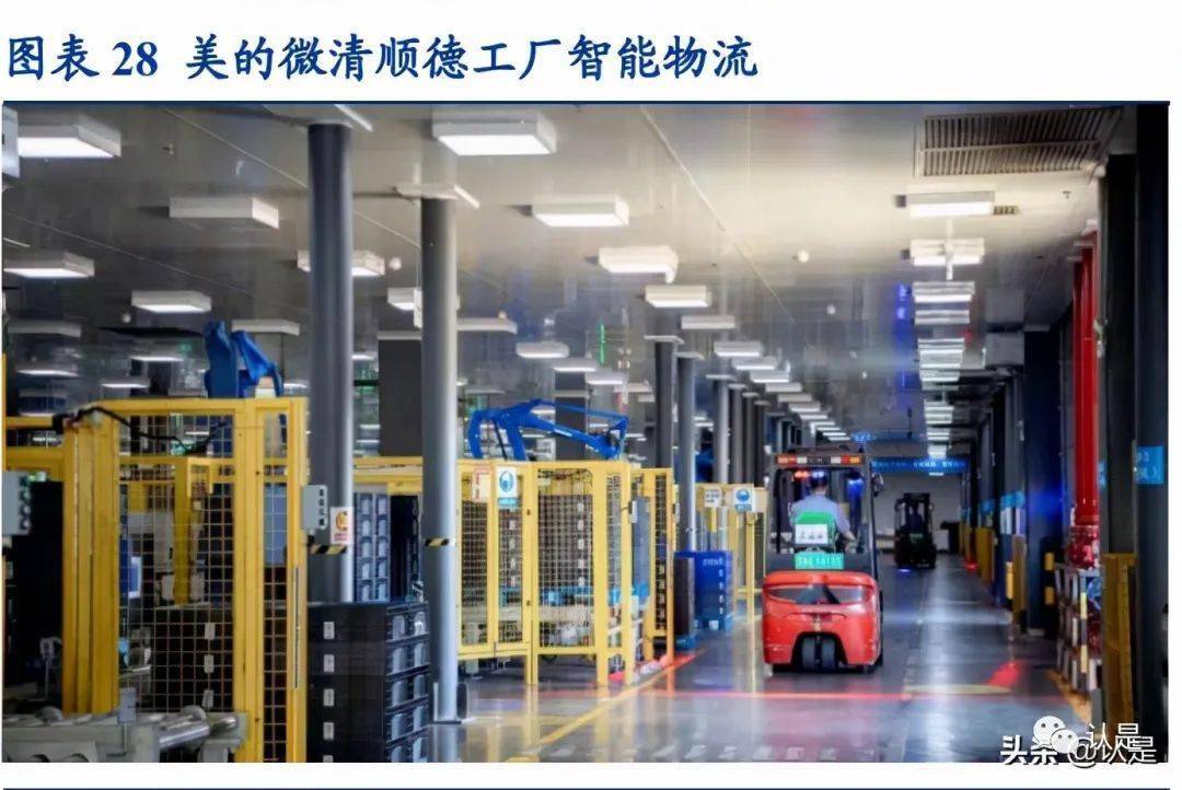 微清顺德工厂:2021 年 3 月美的微波炉顺德工厂成功入选成为世界经济论坛最新的 “灯塔工厂”,成为第二家美的集团旗下智能制造灯塔工厂。美的微波炉顺德工厂是 全球最大的微波炉生产基地之一,年产能超过 4400 万台。据世界经济论坛介绍,该工 厂通过在采购、生产、质检、物流、销售等环节实施数字化,订单交付周期缩短 56%, 2020 年二氧化碳排放量同比减少 9187.2 吨。其五个流程环节的智能化应用具体表现如 下: