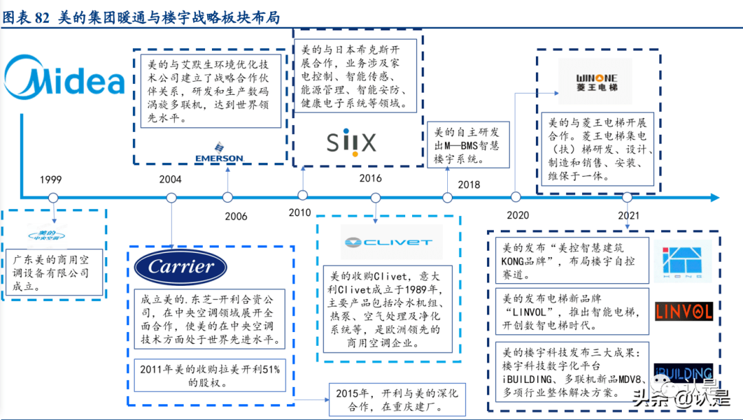 电梯业务:2020 年,美的与菱王电梯开展合作;2021 年,美的发布智慧电梯新品 牌“LINVOL”,推出具备“自我感知、自我诊断、自我调整”的高集成化的智能电梯, 将电梯融入智慧楼宇数字化平台。
