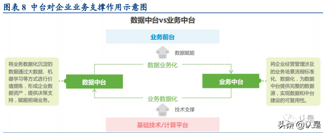 通过对阿里巴巴的案例分析,我们总结了适合建设中台的企业特点:1)业务中会产生 并且应用大量数据,且数据、经验的积累能产生正向效应;2)内部有多条产品线或多 种业态,各业务之间有重复的功能模块;3)企业仍有创新业务扩张或多元渠道建设的 诉求;4)企业有一定的数字化基础,并有能力进行进一步底层建设。(报告来源:未来智库)
