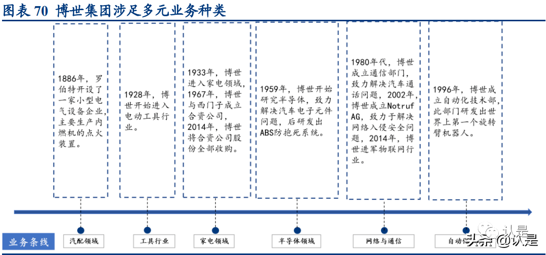 以松下、博世两大百年企业的多元化历程,我们这一简单的历史梳理显然是非常粗糙 的,但仍可以通过其成长历程发现: