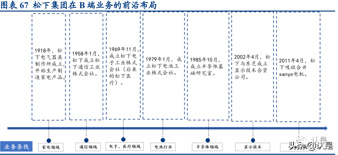 首先,其原生主业与后续扩张业务之间保持关联与共享。松下早期以家电核心为 基础,外延进入通信、医疗、半导体等等领域,而博世则以汽车核心为基础,并 在早期深入布局家电,后续外延至电子元件、通信、自动化等等领域。均由具备 庞大规模潜力的耐用品入局,并在高端制造领域外扩,因其原主业具备极强且稳 健的现金流,成为外延的保障,进而借共有的制造业经验提高新业务的成功概率。