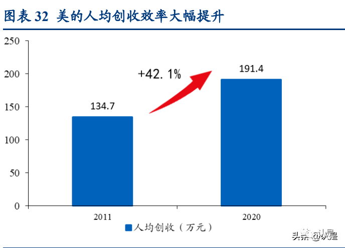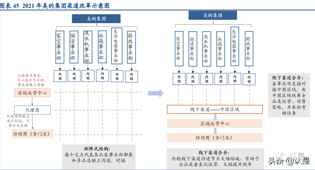 2021 年渠道整合再次体现熵减思路,进一步提升销售效率。除了此前经销层级扁平化外,2021 年以来美的集团对家电线下渠道进行统一整合,由过去的矩阵式结构改变为 各事业部直接对接中国区域,由中国区域统筹全品类运营、销售策略,并承担考核任 务。改革后,事业部与线下渠道的沟通节点大幅缩减,有助于推行集团全品类、套系 化运营战略,成立多品店,大幅提升销售效率。这是在强大数字化基础下得以实现的 效率提升,是打通原品类独立运作后的熵减操作,也是由事业部到家电事业群统一的 体现,大中台战略再次体现。