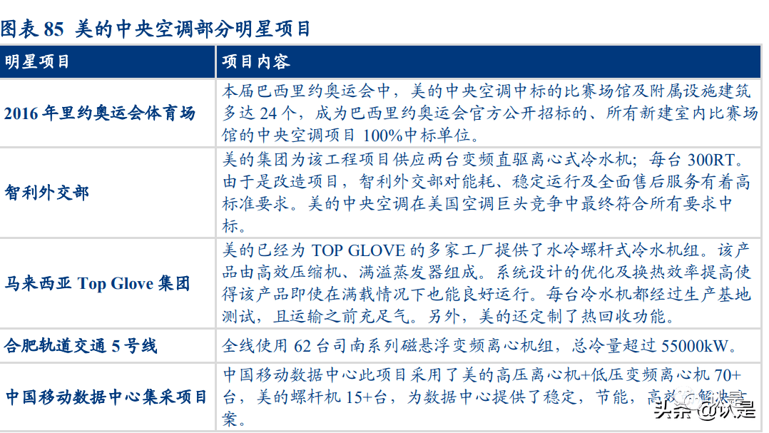 美的中央空调品牌优势明显。美的中央空调在奥运会场馆、政府大楼、工厂、轨道交 通、数据中心等大型项目均有建设经验,展示了公司较强的技术、产品和服务能力。通过不断提升品牌影响力、优化智能化产品,美的中央空调保持强有力的市场竞争优 势。