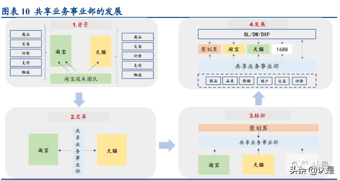成立:为解决上述问题,2009 年集团成立与淘宝、天猫同级别的共享业务事业部, 让技术团队同时支持两大部门,并将两个平台中公共通用的业务功能沉淀到一起, 但实际发展不及预期。虽然在组织架构上三大部门是平级,实际上从业务贡献来 讲淘宝和天猫拥有更多话语权,在资源一定的情况下共享业务事业部很难同时满 足两大事业部的需求。