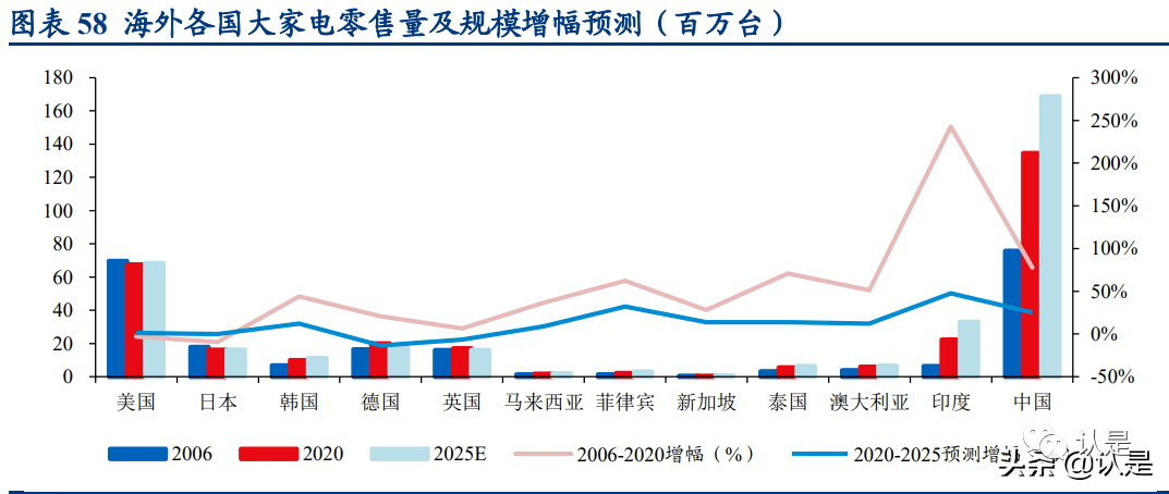 空调:欧洲、南亚、东南亚国家渗透率提升潜力巨大。空调在各国家电发展历程 中,相比冰洗必需品而言偏可选,渗透率受各地区气候、发达程度因素综合影响。当前仅中美日韩空调渗透率为 90%上下;因英德等欧洲发达国家为温带海洋性气 候主导,空调普及率较低,近年因气候异常增大而有所提升;而在印度及东南亚 各国气候潮湿炎热,高温痛点使空调潜在需求巨大,但消费能力不足发展较慢。伴随近年气候及发展国家经济提升,空调海外市场发展空间更为庞大。