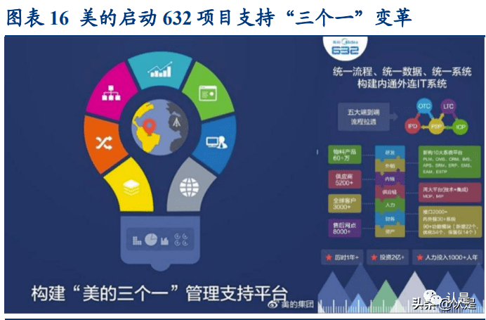 “一个美的,一个体系,一个标准”战略重构全集团流程。2013 年美的集团完成 整体上市,首要工作就是解决过去各事业部内部高度分权、离散化的问题,仅家 电领域的 IT 系统就有 100 多套,业务体系间的数据系统也极度孤岛化。为打破困 境,方洪波先生提出“一个美的、一个系统、一个标准”的三个一变革,基于这 一战略,美的集团启动 632 项目,进行统一流程、统一数据、统一 IT 系统,把独 立、零散的业务整合成共性的、整体的资源。这是美的数字化转型的基础,也是 从离散到共用的初步工作。