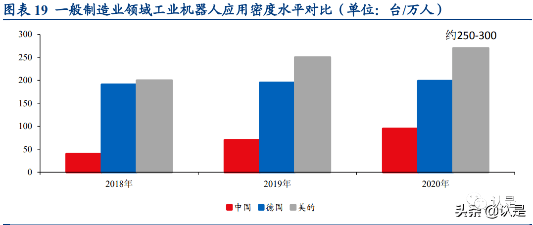 美的工业机器人密度媲美发达国家,远超国内平均水平。根据 IFR 显示,在 2018 年以及 2020 年,中国通用领域机器人密度分别为 40、95,相比之下,机械化程度 较高国家如德国分别为 191、99,有较大差距。而同期美的集团通用领域机器人密 度约为 200 和 250,远超国内行业平均,并超过德国平均水平。美的凭借着极高的 通用领域机器人密度大幅提升工作效率、降低生产成本,在与国内甚至国外品牌 的同质hahabetsports网页化竞争中保持着较大的优势。