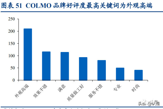 COLMO 销售额迅速扩张,产品广受好评。COLMO 成立短短三年间销售额呈现 激增之势,据公司披露,截至 2021 年 10 月销售额已突破 30 亿元。我们对 COLMO 京东官方旗舰店的热评进行分析,出现频率最高的关键词是外观高端、效 果良好、产品满意以及质量做工好等,品牌高端形象已初步呈现。