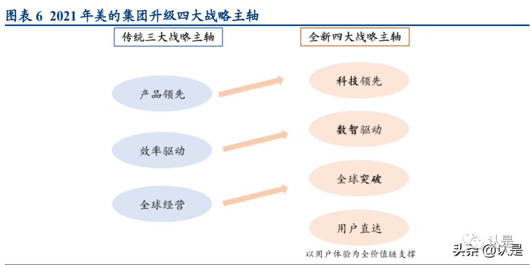 第二次战略主轴调整,美的集团高起点上再超越。在调整组织架构的同时,美的集团 重新确定四大战略主轴,将“产品领先”升级为“科技领先”,将“效率驱动”升级 为“数智驱动”,将“全球经营”升级为“全球突破”,同时强调以用户体验为全价 值链支撑,强调“用户直达”。全新战略主轴的升级无不彰显美的未来将在智能化、 数字化、全球化方面布局的决心。
