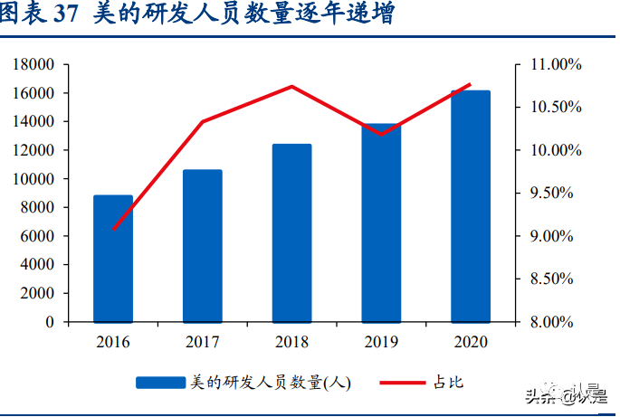 美的在研发领域投入处于行业高位。2016-2020 年,公司研发投入与研发人员数量 不断增加,至 2020 年研发投入与研发人员数量分别为 101.19 亿元、16071 人,均 处于行业内高水平地位。2020 年美的获得中国发明专利授权 2890 件,海外授权专 利 570 项,国外专利申请 13859 件,连续 5 年位居行业第一。