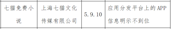 其中,存在问题的应用软件名单中涉及了上海七猫文化传媒有限公司开发的“七猫免费小说”APP,版本号5.9.10。该软件涉及的问题包括应用分发平台上的APP信息明示不到位。