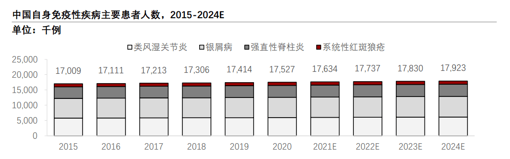 中国自身免疫性疾病患者基数大,常见疾病如类风湿性关节炎、强直性脊柱炎、银屑病的发病率均在0.1%-0.3%之间,预计到2024年三种疾病发病人数分别为612万、397万和676万人。