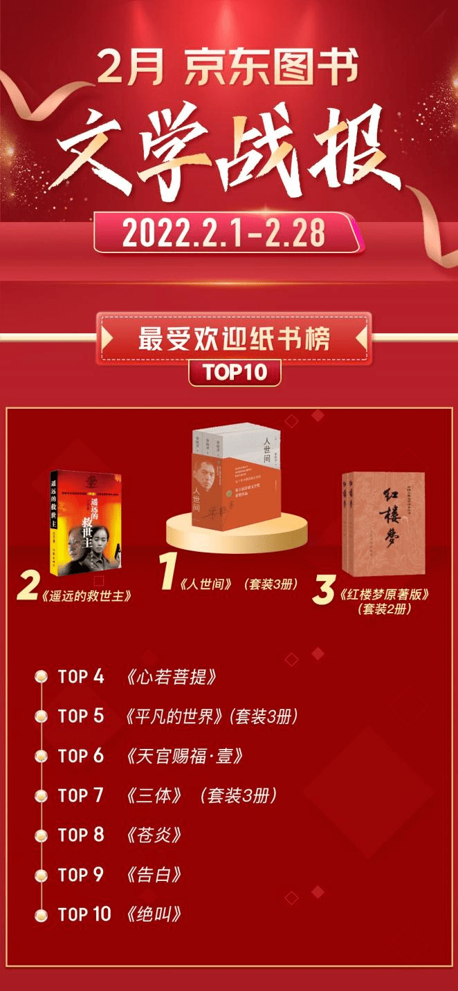 2月文学类最受欢迎纸书榜中,作为央视同名电视剧热播原著的《人世间》(套装3册)名列第一,这套书由著名作家梁晓声所著,其中以北方省会城市一位周姓平民子弟的生活轨迹为线索,从二十世纪七十年到改革开放后的今天,多角度、多方位、多层次地描写了中国社会的巨大变迁和百姓生活的跌宕起伏,艺术而雄辩地展现了平民百姓向往美好生活的人生努力和社会发展的历史进步,堪称一部“五十年中国百姓生活史”。紧随其后的同样是影视作品的原著小说,即豆豆所著的电视剧《天道》的原著小说《遥远的救世主》,位居季军之位的则是跨越时空的经典《红楼梦原著版》。