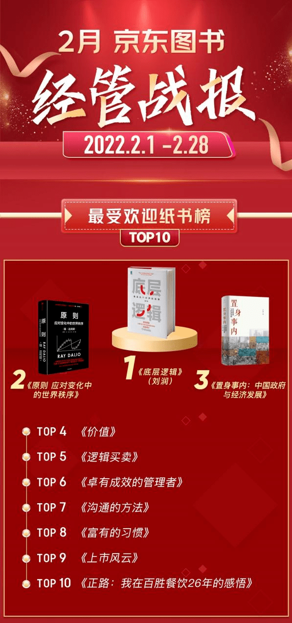 2月经管类最受欢迎纸书榜中,《底层逻辑》从上月的亚军之位晋升榜首,书中中国著名商业顾问刘润把在《5分钟商学院》中讲述的底层逻辑的内容做了总结,分享了是非对错、思考问题、个体进化、理解他人和社会协作五个方面的底层逻辑。排名第二的《原则 应对变化中的世界秩序》是今年1月出版的新书,瑞·达利欧在这本新书中探究的是社会和世界的运行规律和原则,他考察了500年财富和权力的所有重大变化背后反复出现的模式和因果关系,并以此为基础推断未来。排名第三的《置身事内:中国政府与经济发展》是复旦大学中国社会主义市场经济研究中心、经济学院副教授,上海国际金融与经济研究院研究员兰小欢多年教学、调研与研究内容的凝练,他将经济学原理与中国经济发展的实践有机融合,以地方政府投融资为主线,深入浅出地论述了中国经济的发展,笔触简练客观,并广泛采纳了各领域学者的最新研究成果。