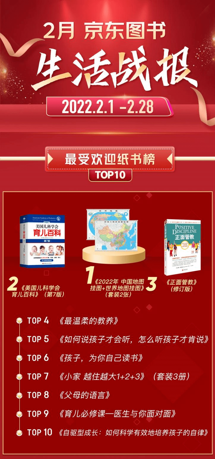 上月位于榜单第三位的《2021年 中国地图挂图 世界地图挂图》随新版迭代,有《2022年 中国地图挂图 世界地图挂图》新登榜首;《正面管教》延续了上月的前三之位,《美国儿科学会育儿百科》新登榜单亚军之位。