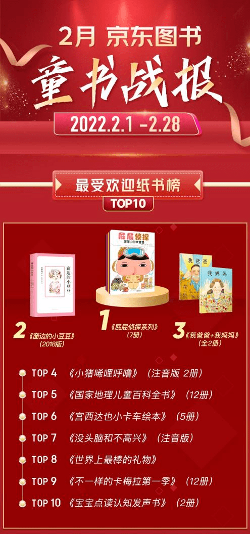 2月童书类最受欢迎纸书榜中,榜首的《屁屁侦探系列》(7册)是当之无愧的超级畅销书,故事中三七开的发型,犀利的眼神,敏捷的身手的屁屁侦探,总能在细微之处闻到可疑的味道,然后把案件“噗噗”地解决掉,凭借幽默的故事语言、华丽的画风,加上迷宫、解谜、找细节等益智游戏,书中带领小读者展开一系列推理及案件的侦破活动。亚军之位的《窗边的小豆豆》和《我爸爸+我妈妈》(全2册)是引进以来便常销不断的童书经典,前者是影响20世纪的儿童文学杰作,讲述了作者黑柳彻子上小学时一段真实的故事;后者则是安东尼·布朗以超现实笔触创作的绘本佳作。