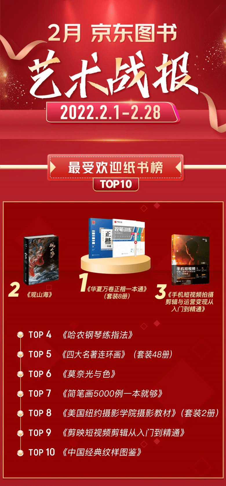 2月艺术类最受欢迎纸书榜中,《华夏万卷正楷一本通》(套装8册)延续了上月的榜首之位,这套书提供了汉字书写一站式解决方案,为练字者提供老少咸宜的循序渐进内容。紧随其后的《观山海》则是绘者杉泽以《山海经》作为灵感来源,结合当代审美品位及其特有的中式绘画风格进行的绘画创作。位列第三的《手机短视频拍摄剪辑与运营变现 从入门到精通》全面讲解了手机短视频的拍摄、剪辑与运营变现,在当下手机直播盛行的流量时代,这本书无疑具有极强的实用性和适用性。