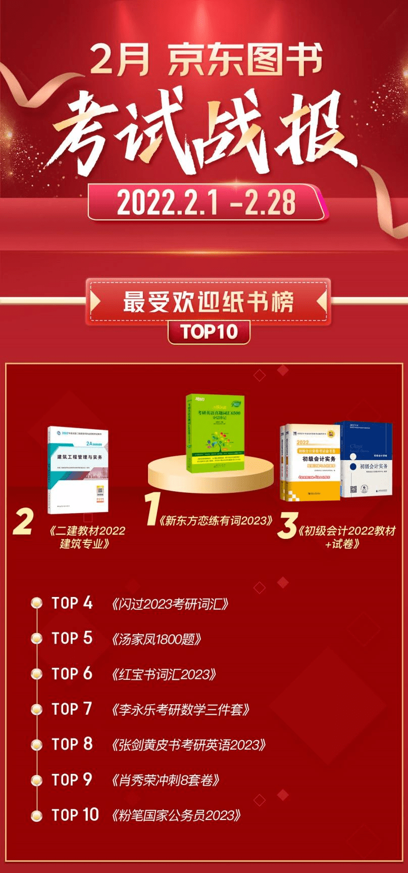 2月考试类最受欢迎纸书榜中,考研者几乎人手一本的《新东方恋练有词 考研英语真题词汇》延续了上月的榜首之位,紧随其后的是两本教材:《二建教材2022建筑专业》和《初级会计2022教材+试卷》。