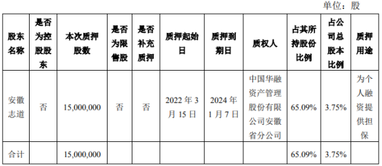 公告显示,安徽志道共持有公司股份数量为23,044,450股,占公司总股本比例为5.76%。累计质押20,260,000股股份,占其所持有股份比例为87.92%,占公司总股本比例为5.07%。hahabet.cn综合运动平台
