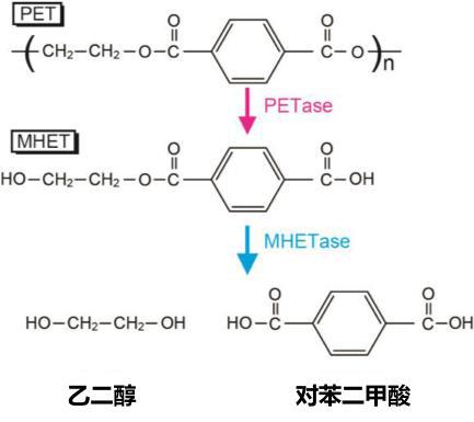 由于PET这类高聚物中各单体间的化学键很难被普通方式破坏,在普通的塑料回收过程中,仅仅可以实现原料的降级再利用。例如,食品级PET塑料瓶回收后用来加热溶解成PET颗粒,之后再重新进行热加工,制成PET纤维,再利用纤维制造塑料绳或者等。而来自细菌的PET降解酶却可以破坏这种高聚物中的化学键,将其还原为对环境影响很小的对苯二甲酸和乙二醇。