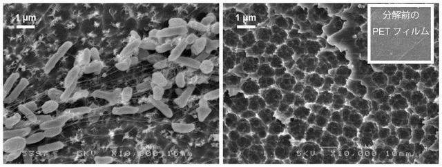 左图:PET分解细菌附着的PET薄膜表面,右图:(部分)分解后的点蚀状表面,右上小图:分解前的薄膜表面,来源:参考文献5