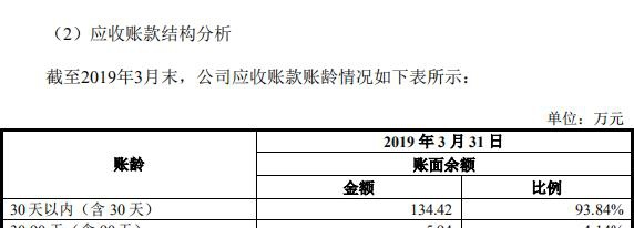 截至2019年3月末,公司应收账款的总额为142.25万,其中大部分的账龄在30天以内,所有账款的账龄都在1年以内。从应收账款的集中度看,第一大客户占比为61.86%,存在账款过于集中的现象。