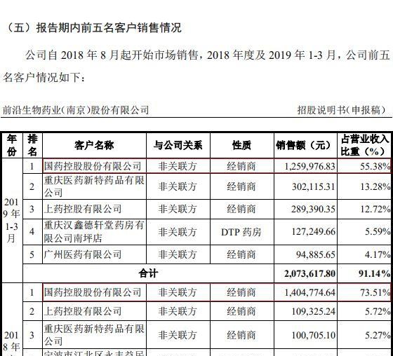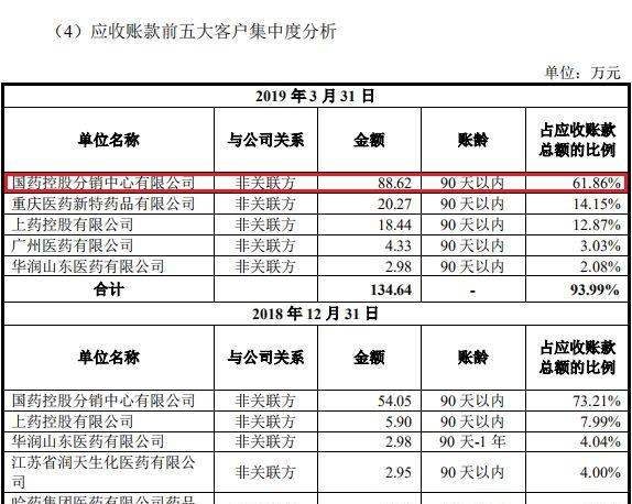 同时公司存在对下游客户严重依赖的问题,根据公司2018年以及2019年一季度的对前五大客户业务占比显示,公司对第一大客户国药控股存在严重依赖的问题。2018年对国药控股的销售占比营业收入比为73.51%,到了2019年一季度虽有所回落但是仍有55.38%,因此依赖第一大客户问题依然存在。