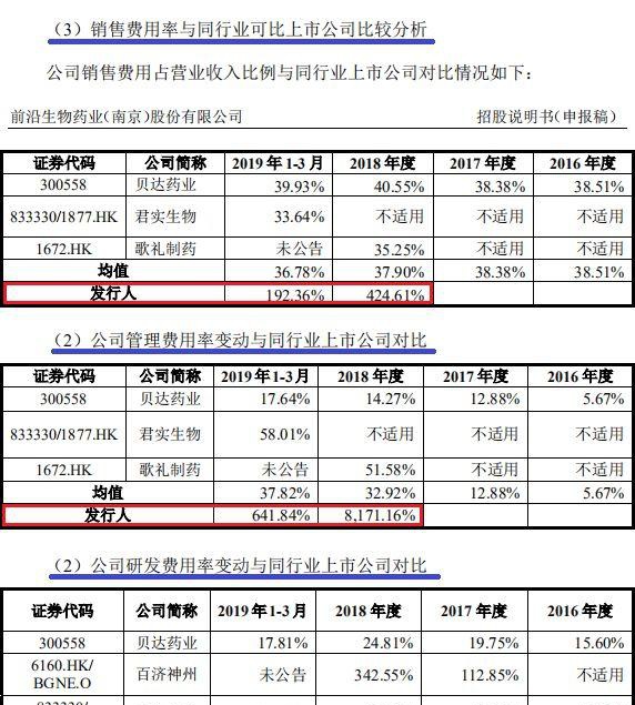 我们以最近提到的君实生物、泽璟制药、艾迪医药作为对比对象,就能比较好的发现前沿生物在研发人员方面的问题。综合这四个企业的研发人员总数和占比可以发现,平均研发人员总数为99人,平均占比为28.99%。而低于平均值的是艾迪药业和前沿生物两家企业,其中艾迪药业选择是的科创板第二套上市标准,与其他三家都不同。而前沿生物选择的也是科创板第五套标准,因此不管对标何种企业,前沿生物的研发人员总数也是最低的。