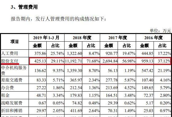 从管理费的明细中可以看到,从2016年至2019年一季度,股份支付费用占管理费总额的比例都是最高的,公司的多次股权激励也多次支付股份确认费用。