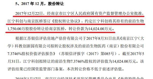 对于国有资产转让的事实,前沿生物在招股说明书中也做了说明:南京医桥确实曾为持股平台,但目前已经不再持有南京医桥股份,对外也没有任何实际经营的活动。