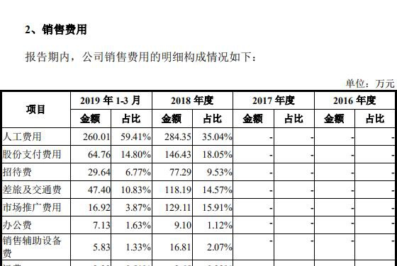 同时,我们从销售费用明细中看到一个问题,就是2018年与2019年一季度的营收不过是191万和227万,而同期产生的销售费用却大幅高出营收,2018年销售费用是营收的424.6%、2019年一季度也有192.5%。根据公司的解释,销售费用高是因为市场对创新药需要一个了解、认知和接受的过程。所以在自艾可宁于2018年5月获得国家药监局上市批件后,公司开展了医学推广活动,增加医疗界对艾可宁的了解,因此也就是销售费用大幅增加。