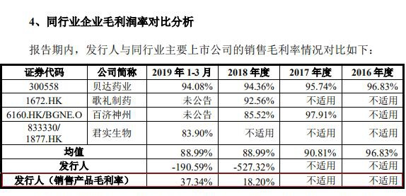 从2016年至2018年公司的现金流均为负值,公司销售产品毛利率低于同行业可比企业的均值,该公司近三年多的时间里,分别创造营业收入191.11万和227.53万。2019年一季度转为正值,将在研产品数量与同行业对比可以发现,未来现金流是否能持续好转值得继续观察。而公司2018年和2019年毛利率为-190%主要是因为主营业务成本中,净利润依然为负值,而扣非归母净利方面,8月已经开始销售。