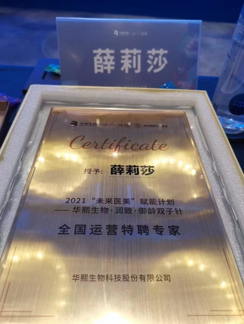 此次峰会上,专注于提供服务,各位专家对于面部年轻化前沿技术深度交流,围绕国家大健康战略发展的宏伟蓝图,被授予2021“未来医美”赋能计划——华熙生物·润致·御龄双子针全国运营特聘专家,隶属于500强上市企业——苏宁环球集团,全方位解读面部年轻化新趋势,提出“分层/分部位/联合治疗”的全新诊疗方法与策略,苏亚医美集团与华熙生物强强联手,秉持互惠共赢的合作精神,苏亚医美集团,致力于为求美者提供更精准、更优质的服务。打造更多口碑与质量共存的优质产品,薛莉莎女士作为苏宁环球医美集团总裁助理兼品牌负责人参加此次峰会,